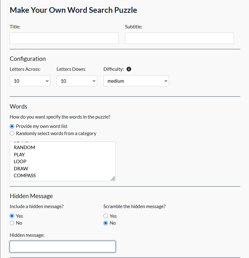 - These word search creators work best if you give them more words than the size of the word search needs. If you have a size of word search in mind, I recommend a list that has at least 1.5 times the amount of letters in it. So if you would like a 10×10 word search, I recommend at least 150 letters in all your words combined.