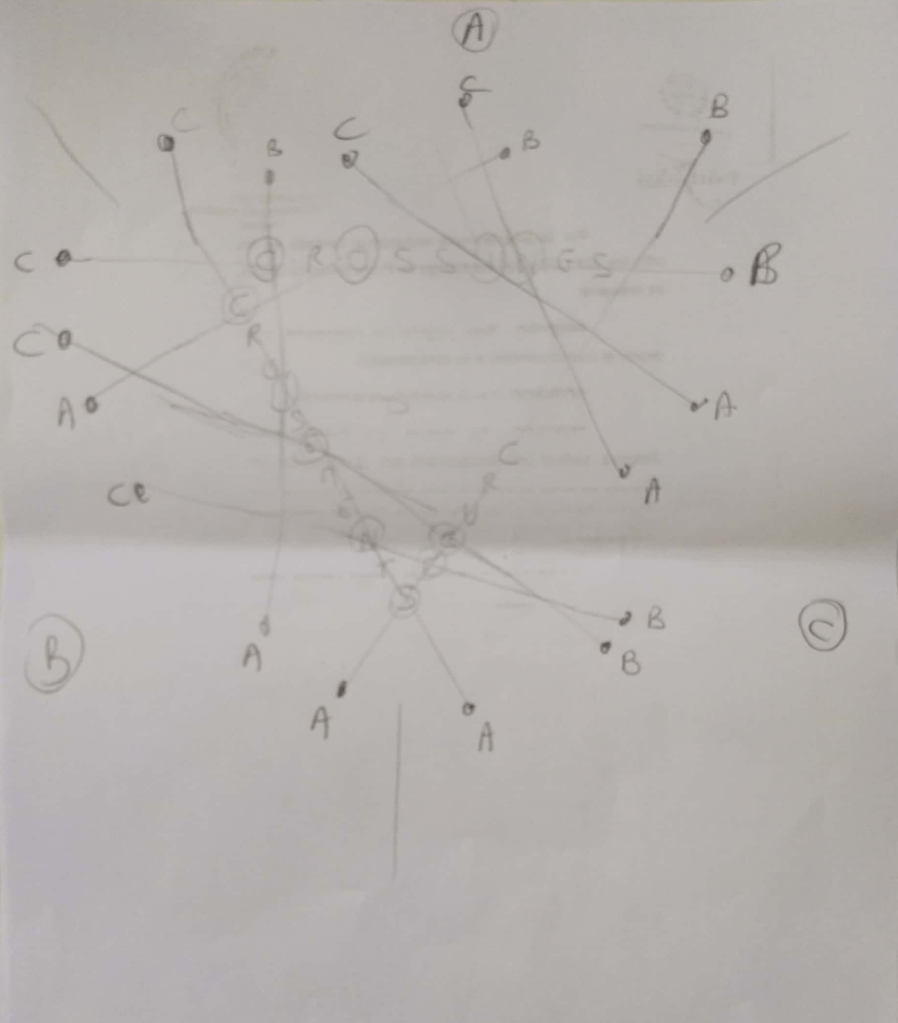 We now can naturally connect all the words two by two, using straight lines. And, given that the word written in the middle is crossings (and its translations), we look at the letters located at the crossings between two lines: