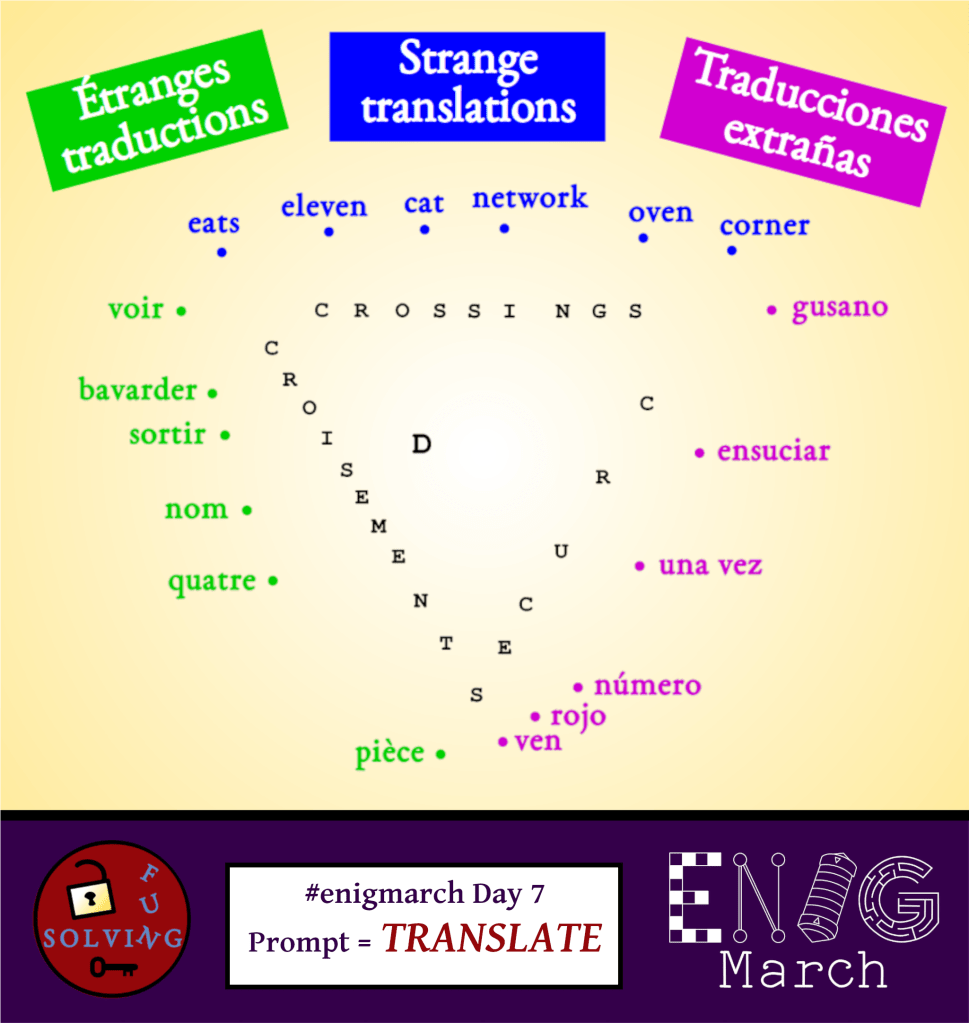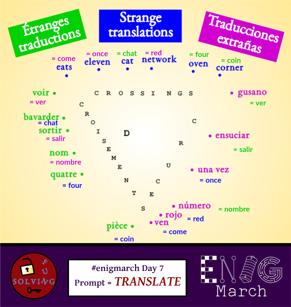 For EnigMarch, I usually try to alternate between puzzles in English, Spanish and French. But for Day 7 in 2022, the prompt was Translate, so it made me want to try a trilingual puzzle. You may want to try to solve it before continuing reading (obviously a lot of spoilers ahead!). Feel free to use a dictionary if you don’t speak one of the languages.